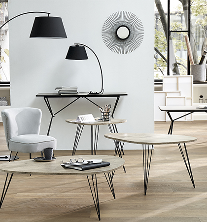 Les formes deviennent elles aussi plus modernes, et on trouvera aussi bien une grande table à manger rectangulaire aux lignes fuyantes, qu'une table basse à la découpe certes plus originale mais toujours très discrète.