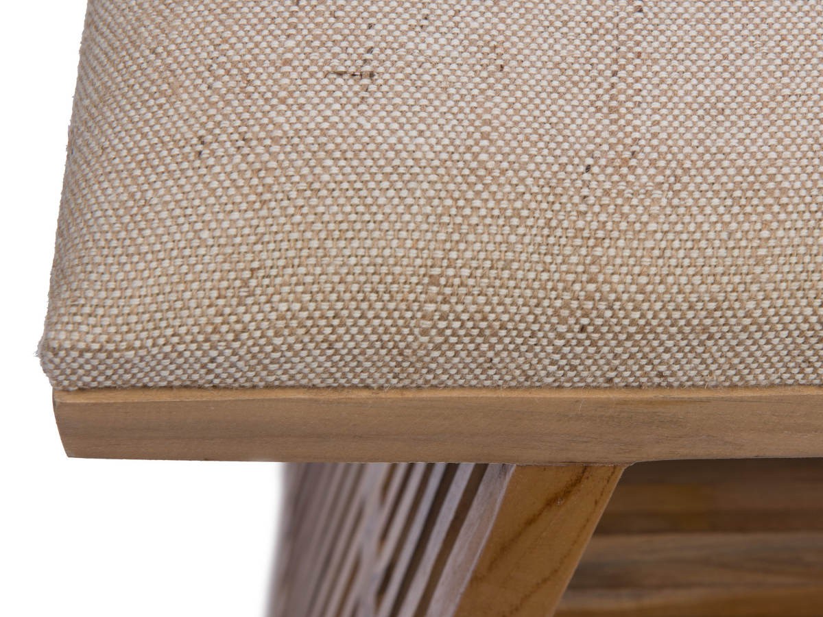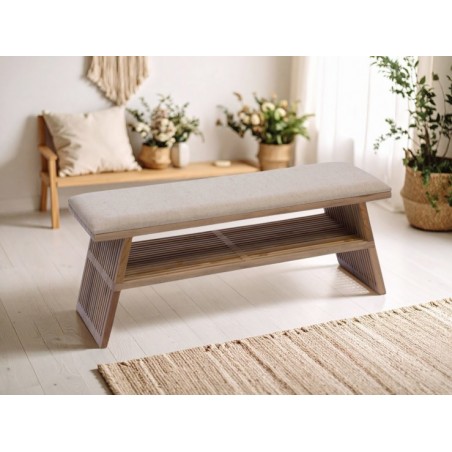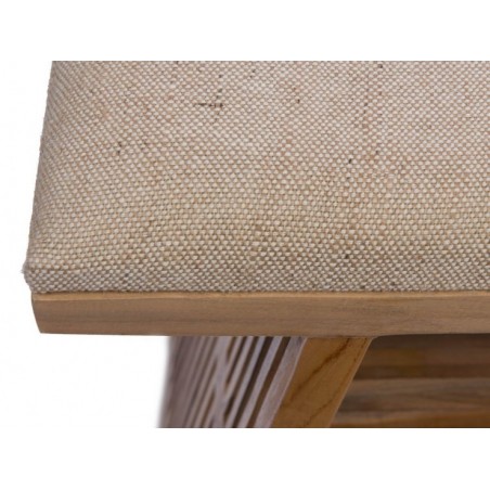 Conçu en bois de teck, le banc Calopsite présente un design moderne avec une assise rembourrée beige clair qui assure le confort. Côté originalité, sa structure à lattes design apporte une touche authentique, se distinguant ainsi des bancs classiques.