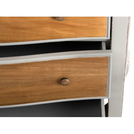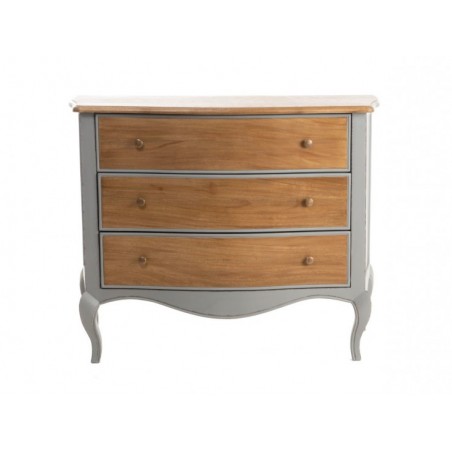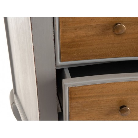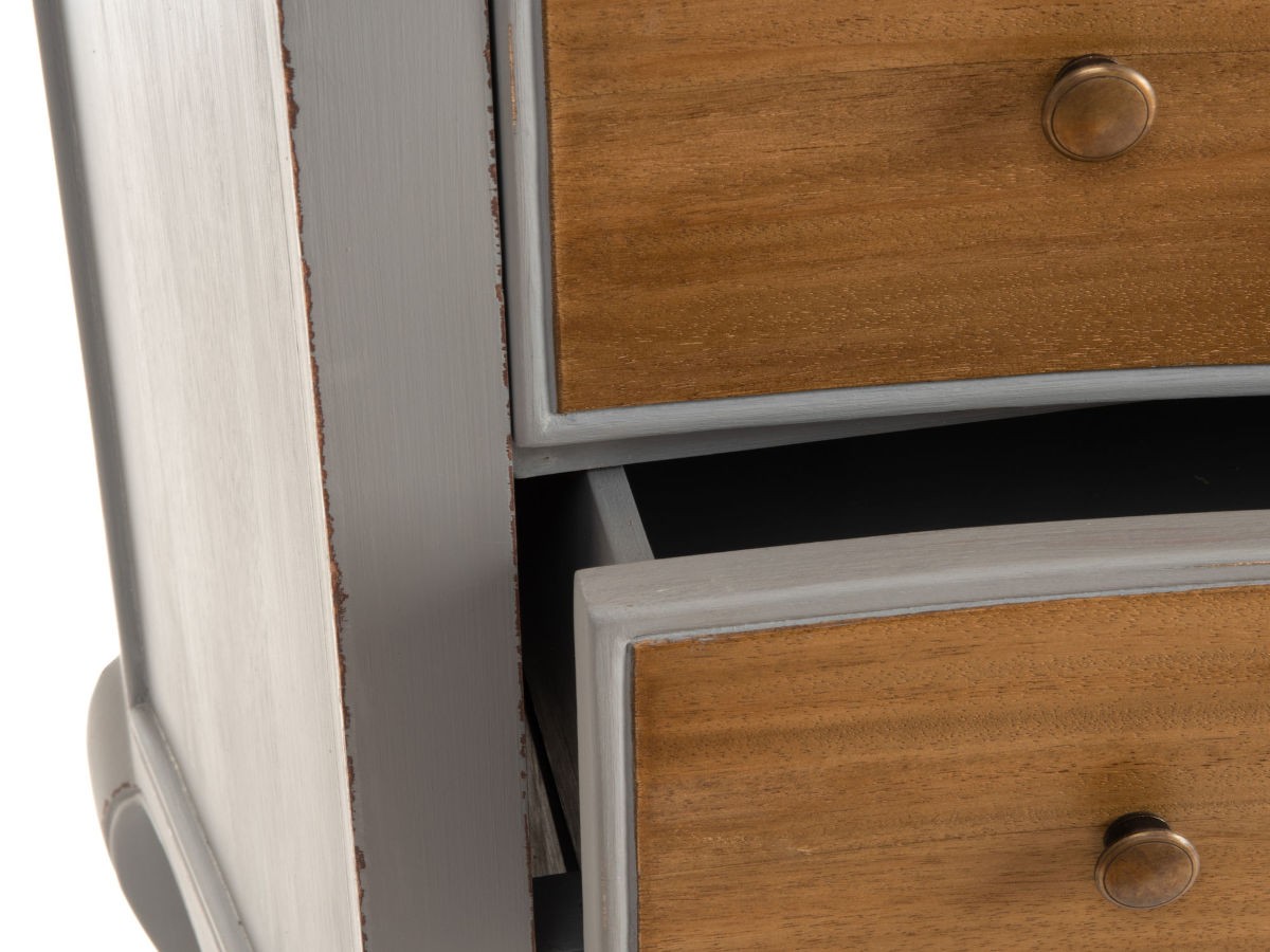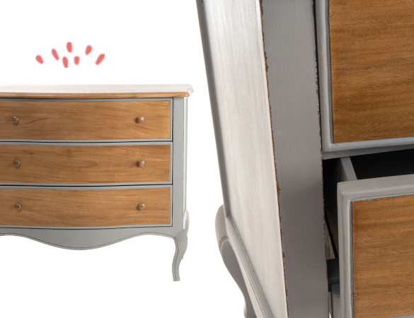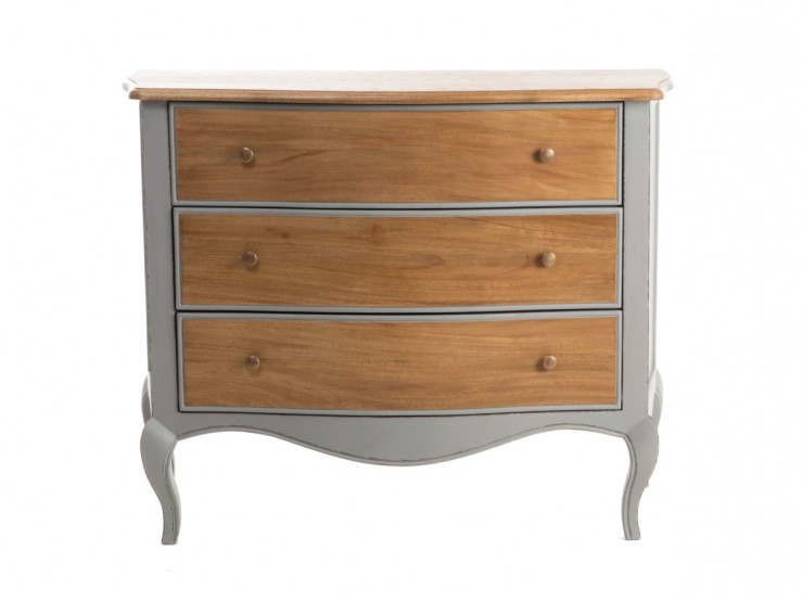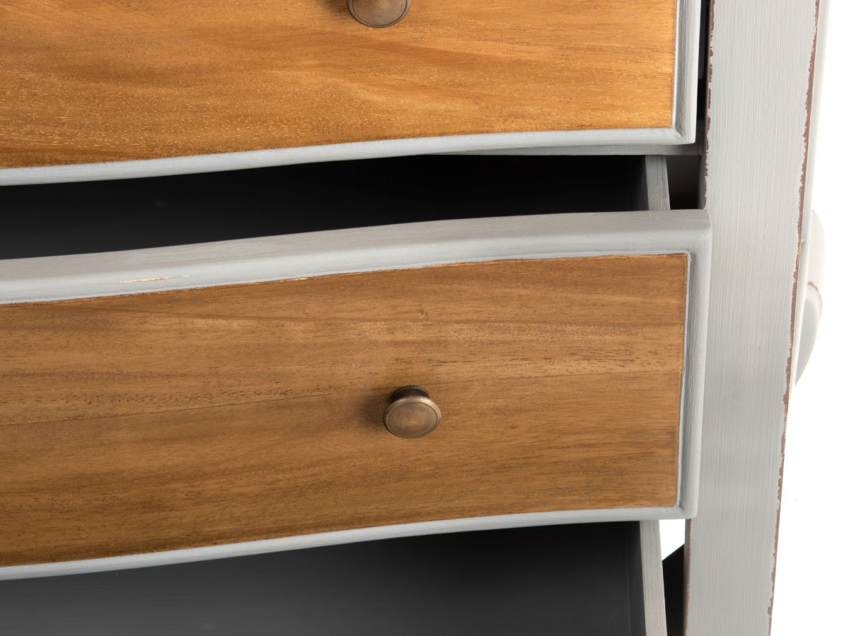 Son design traditionnel, ses lignes arrondies et sa douce couleur grise font d’elle une commode au style romantique par excellence. Sa particularité ? La couleur grise de la structure contraste avec le plateau et la façade des tiroirs qui sont en bois clair.