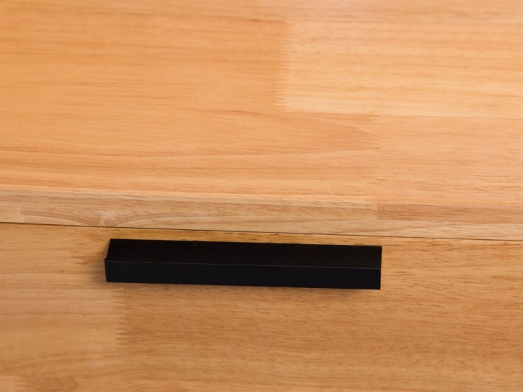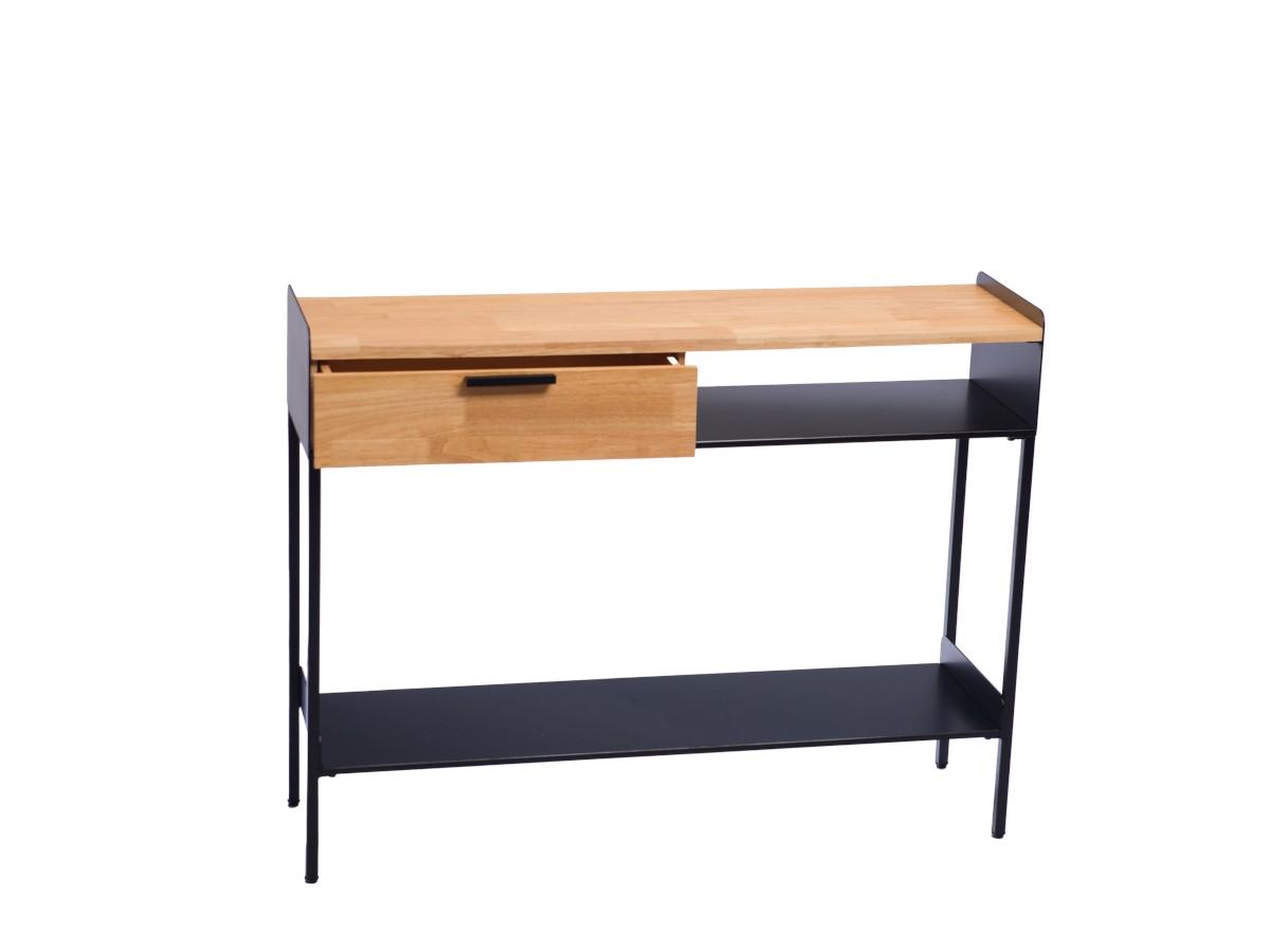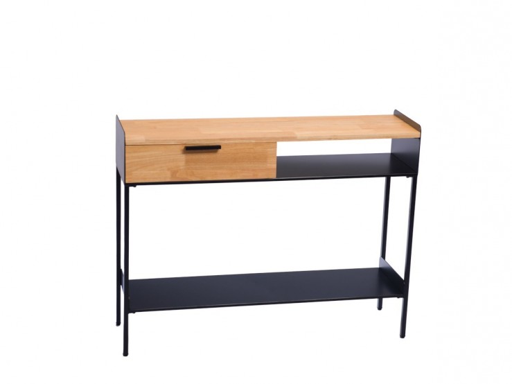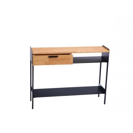 Son plateau en bois clair crée un contraste élégant avec la structure métallique noire. Il en résulte une console à l'allure raffinée et moderne.