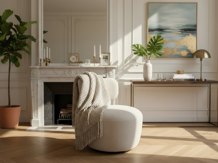 Mariez le coloris beige avec un plaid en grosse maille terre de sienne et un guéridon doré pour accentuer l'esprit "chic et cosy" de votre pièce.