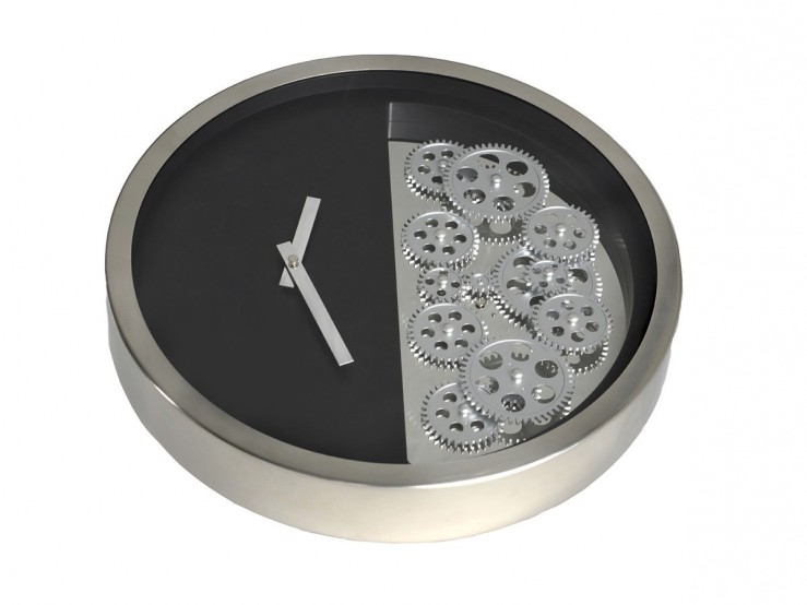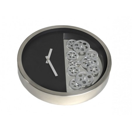 Un mécanisme apparent, et mis en valeur par le gris métallisé, que l'on retrouve également au bord de l'horloge.