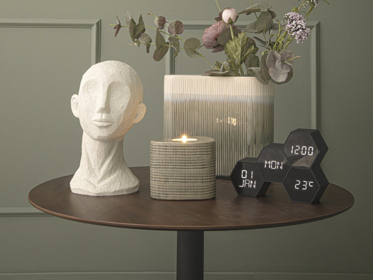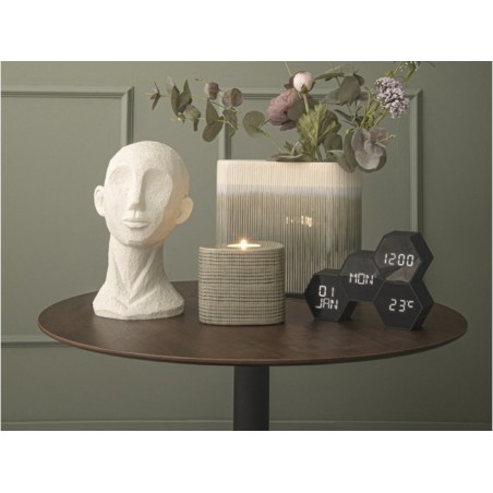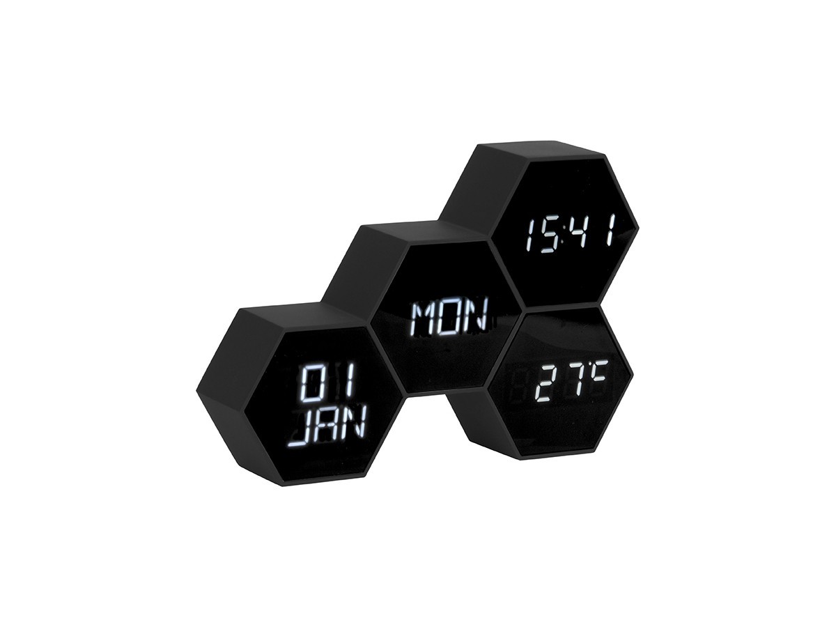 De conception hexagonale, ce réveil indique bien plus que l’heure et vous apportera plusieurs types d’informations telles que le jour actuel, la date ainsi que la température de la pièce. Celles-ci sont visibles en un simple coup d'œil grâce aux 4 facettes aux formes géométriques.