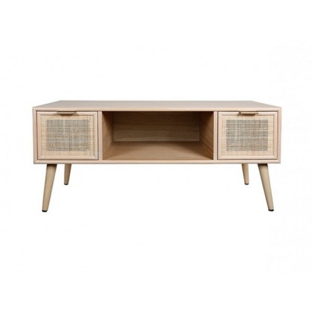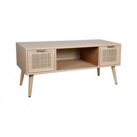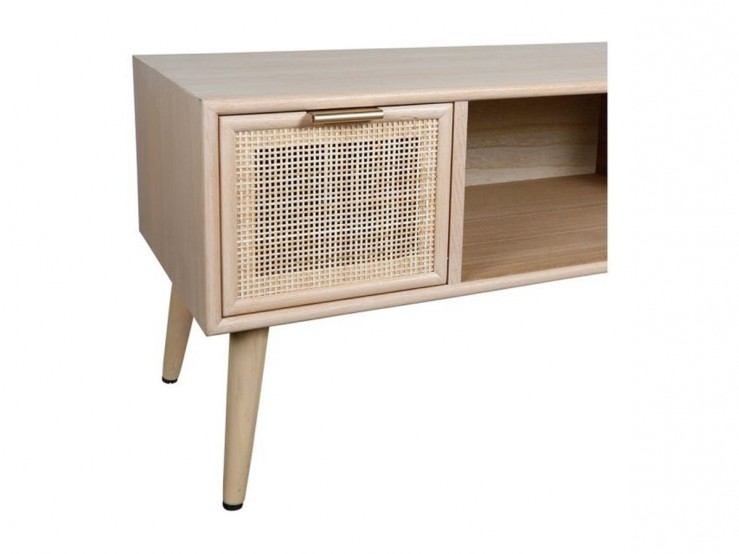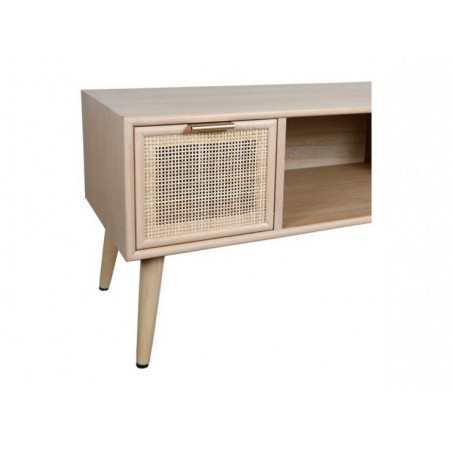 Ce petit meuble de rangement vous permettra à la fois d'accueillir votre grande télévision, tout en vous offrant 3 espaces de rangement très pratique : deux tiroirs à la façade en rotin tressé et un grand plateau.