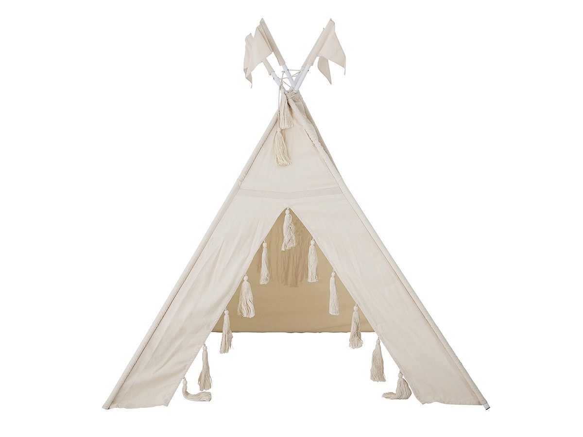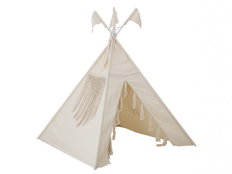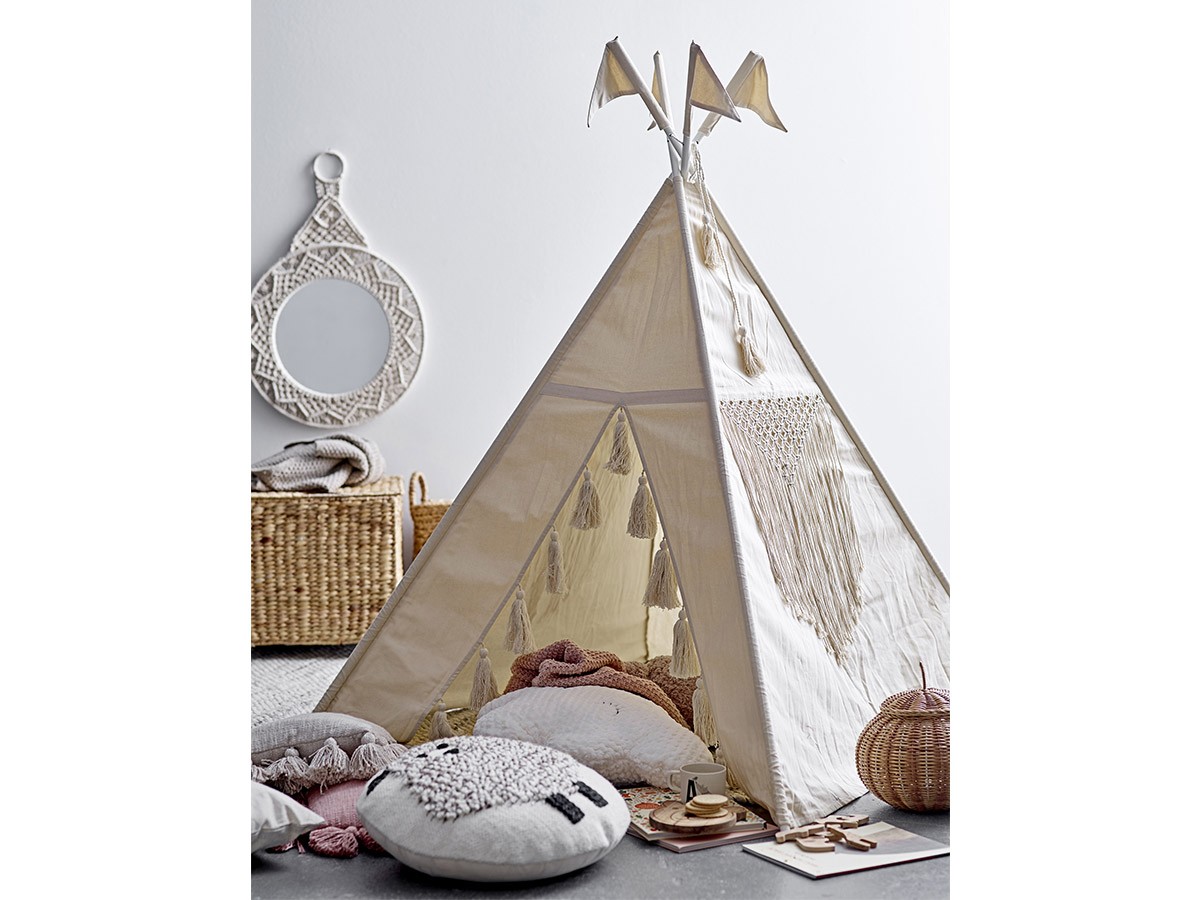 Fini les cabanes fabriquées avec des draps ! Le tipi enfant Bloomingville est en plus en véritable atout décoratif aux couleurs fraîches et naturelles. Sa toile est en coton respirant et agrémentée de pompons et de macramés pour une douce ambiance bohème.