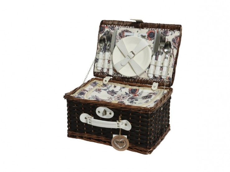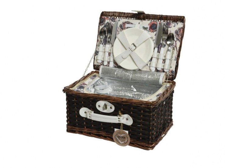 L’intérieur du panier tressé est habillé d’un tissu aux motifs fleuris, pour une pointe de vintage et de poésie. Côté praticité, vous retrouvez deux compartiments : un accueillant les couverts et les assiettes nécessaires pour 4 personnes. Le compartiment interne est isotherme afin d’y accueillir vos sandwichs, salades et vos boissons, tout en les conservant, pour un maximum de fraîcheur. De plus, vous y retrouverez 4 verres à pied, maintenus à l’intérieur par des élastiques.