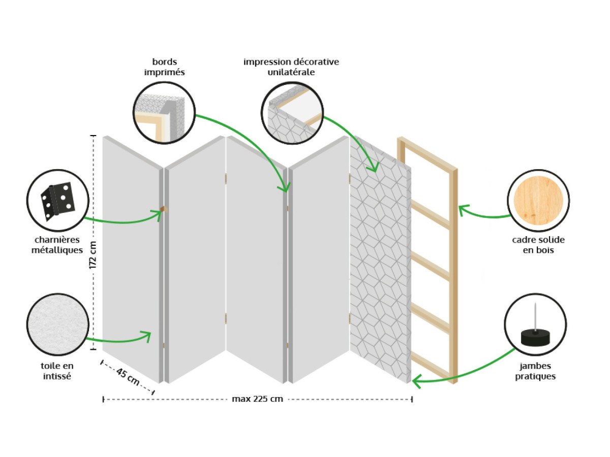 Solide et stable, sa structure est fabriquée en bois de pin. Lors de la livraison et de l'installation, aucun besoin d'assemblage n'est nécessaire, le paravent arrive prêt à l'emploi.