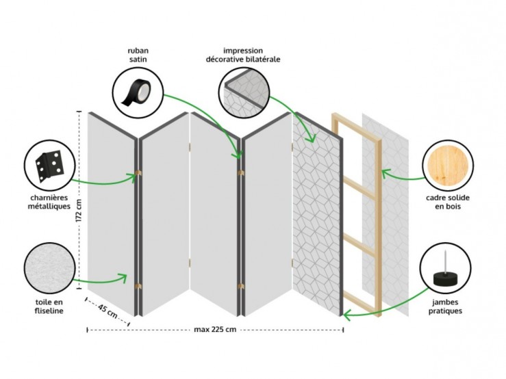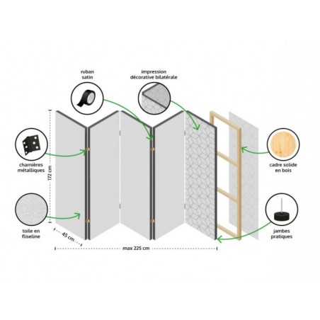 Ce paravent Artgeist est doté de 5 volets de 45 x 172 cm pour des dimensions totales de 225 x 172 cm. L'impression bilatérale sur toile vous offre bien plus qu'un petit mobilier de séparation, il s'agit surtout d'une splendide oeuvre d'art qui sublimera votre pièce.