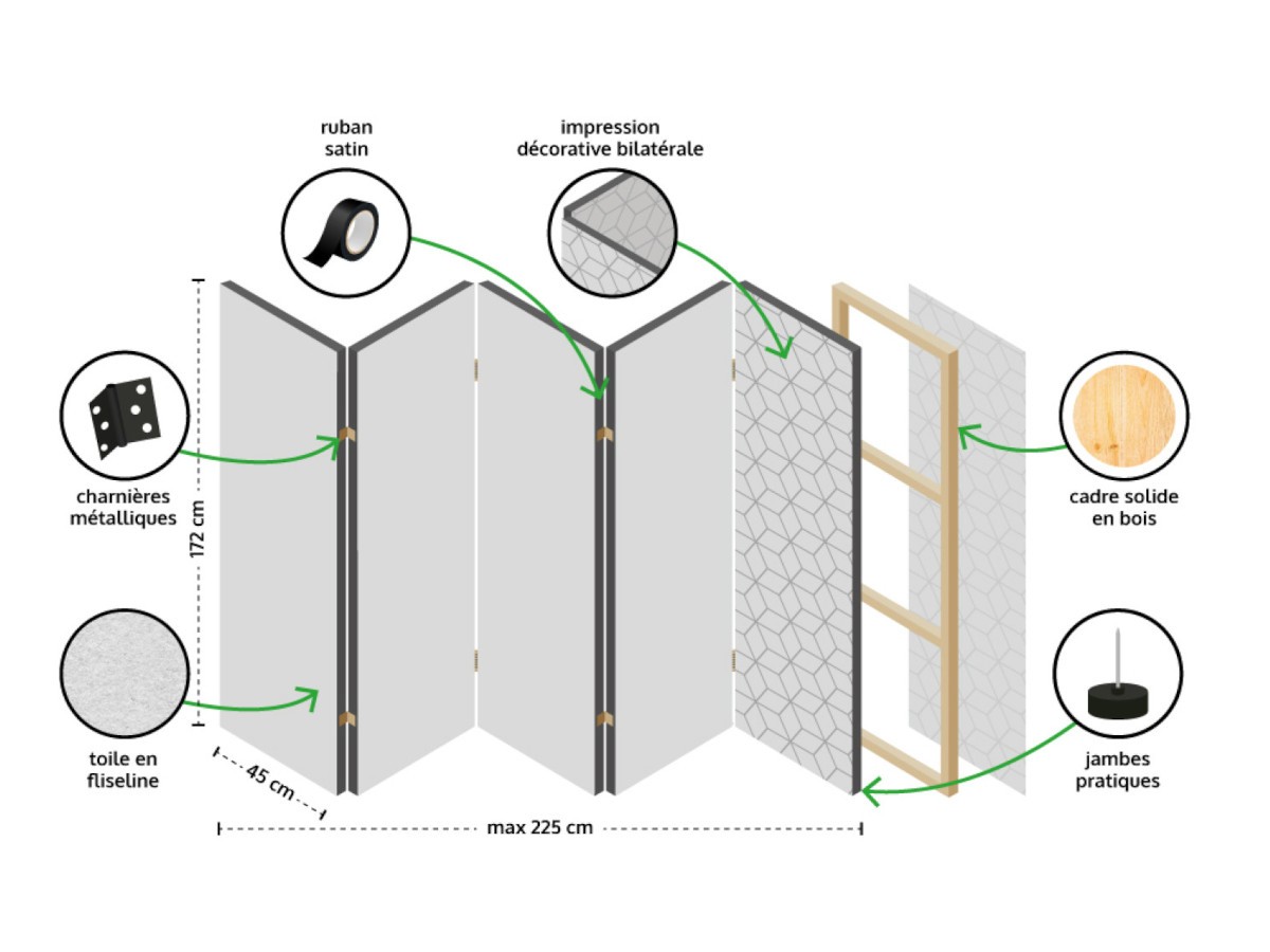 Vous allez tomber sous le charme du paravent à 5 volets Artgeist : un bijou décoratif et fonctionnel pour votre intérieur. Ce paravent se distingue par sa grande qualité ainsi que son impression bilatéral Full HD imitant la texture du bois.