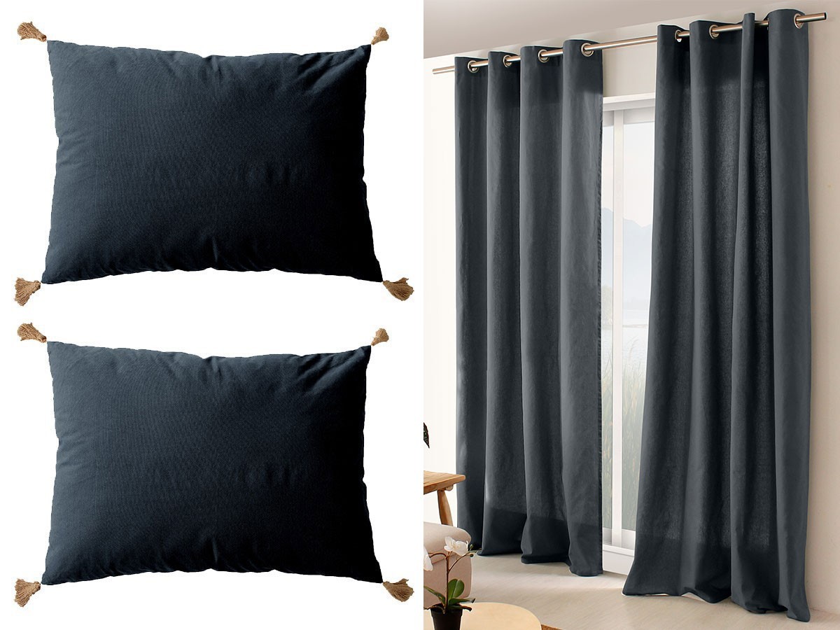 - Lot de 2 rideaux + 2 coussins (coloris : Gris Foncé, Naturel, Argile ou Vieux Rose)