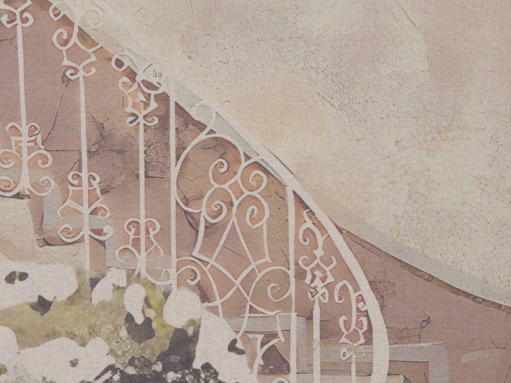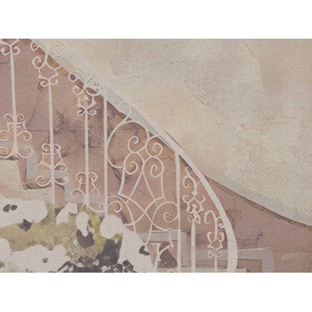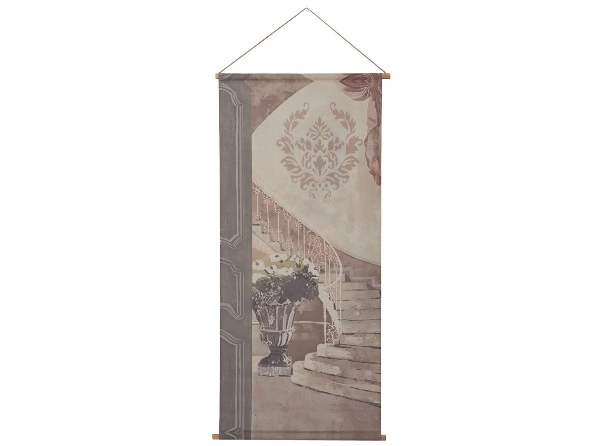 Véritablement romantique, ce kakemono dévoile un escalier blanc décoré avec délicatesse. En premier plan, la porte s'ouvre sur un sublime vase rempli de fleurs. Le mariage des motifs baroques qui ornent le fond, aux couleurs pastel rosé et poudré, offre beaucoup de douceur à l'ensemble.