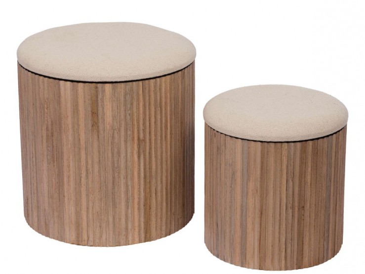 Confortables et polyvalents, ces tabourets revêtent une assise rembourrée tandis que leur structure est en bois exotique naturel. L'assise dévoile un rangement idéal pour les plaids ou petits objets.