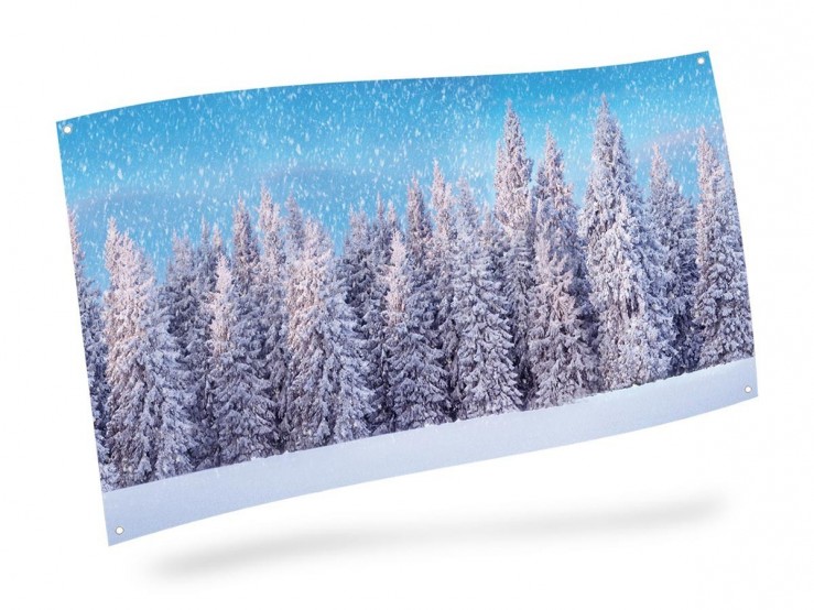 La toile de fond décorative Forêt enneigée dispose d’oeillets pour être accrochée et décrochée sans abîmer le tissu.