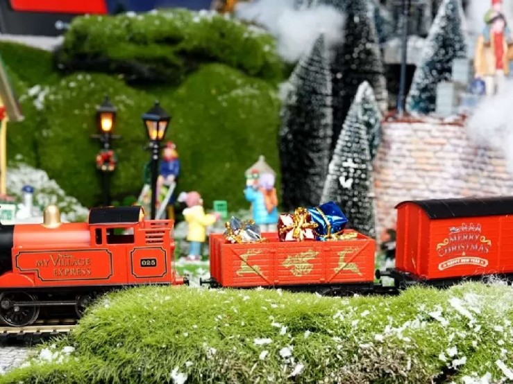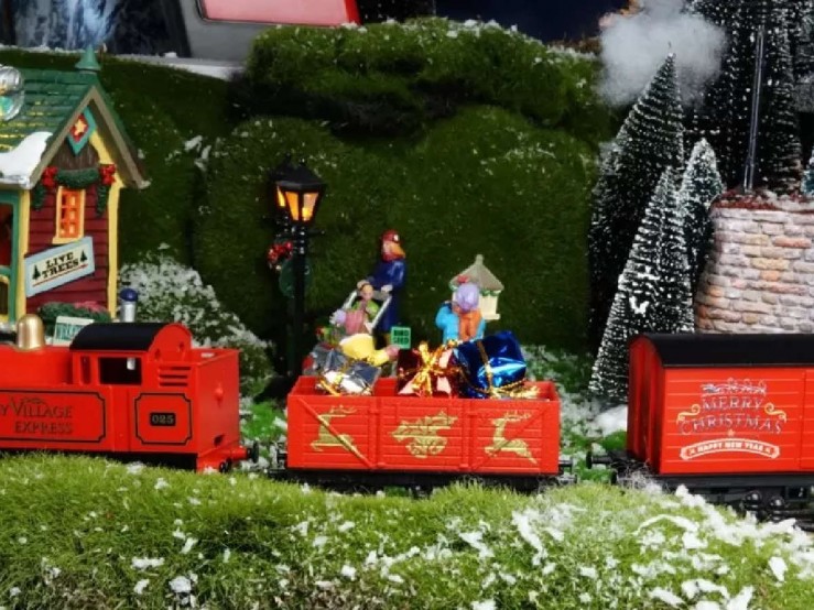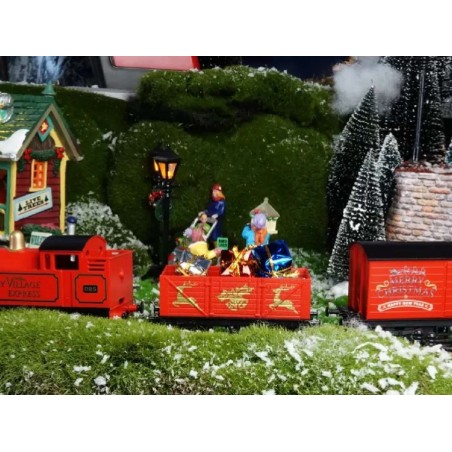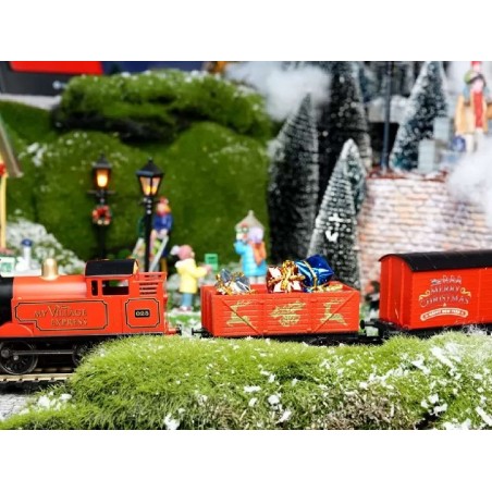 L'animation idéale pour sublimer le pied de votre sapin ou donner vie à un village miniature prend la forme de ce train électrique à l'échelle 1:76. Ses couleurs rouge et or traditionnelles apportent une note chaleureuse et intemporelle à votre intérieur pendant les fêtes. La locomotive tracte deux wagons minutieusement détaillés : le premier déborde de cadeaux festifs, tandis que le second met en scène un joyeux Père Noël.